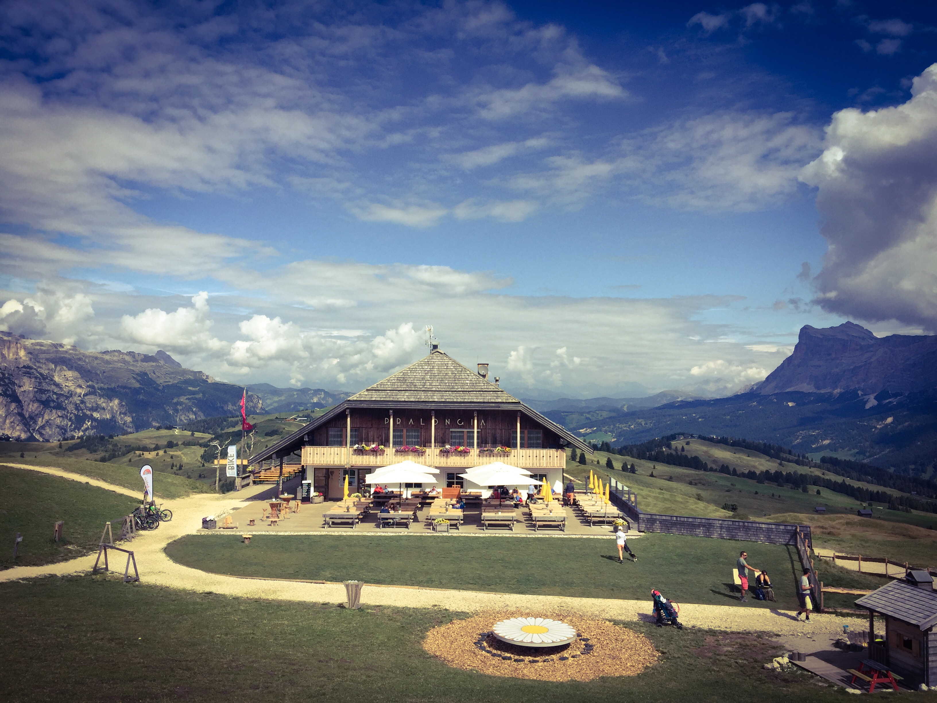 Dopo un po’ di scarpinare arrivo quindi al rifugio Pralongià che, a giudicare dal numero di persone presenti, dev’essere davvero il punto di ritrovo e di riferimento per tutte le partenze ed i passaggi da qui. C’è veramente di tutto, famiglie, ciclisti, trekker, passeggiatori della domenica, animali… insomma, e io che pensavo di fare un percorso tipo trekker solitaria all’avventura! Vabbeh, in effetti non posso certo pretendere di essere sola in mezzo ai percorsi sulle Dolomiti ad agosto!