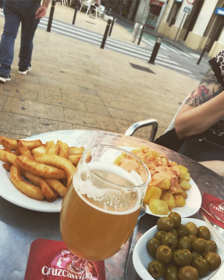 Ecco quindi, per dare inizio alle mie giornate spagnole, il primo giro di tapas. Nello specifico si riconoscono le mitiche patatas bravas, i chocos fritos e le olivia rellenas, ovviamente bagnate dall’immancabile clara!