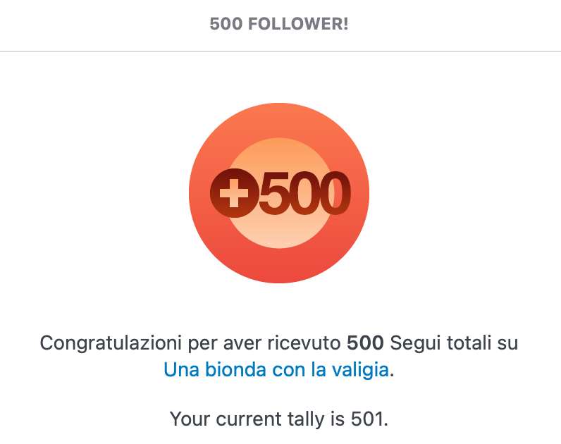 Ed è proprio questo il caso. Spulciando tra i vari post n bozza che mi stavo preparando a correggere e a programmare noto che WordPress mi segnala il raggiungimento di 500 follower.