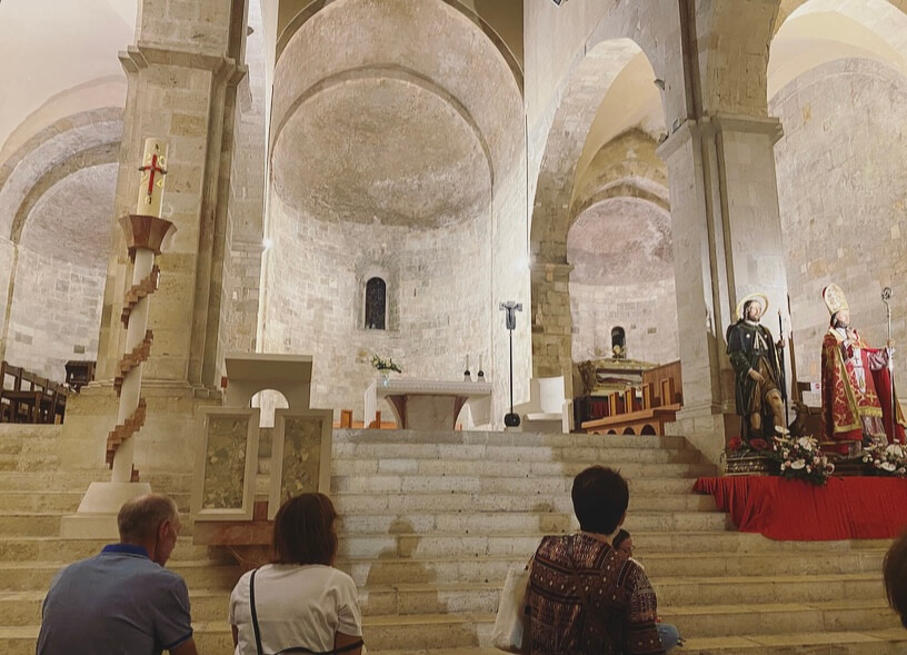 Una piccola curiosità: ai lati della facciata esterna, si possono notare delle linee che indicano delle lunghezza greche. Queste venivano infatti utilizzate per misurare le stoffe quando venivano vendute durante il mercato. Esse erano poste davanti alla Chiesa proprio perché davanti all’occhio di Dio non si poteva imbrogliare.